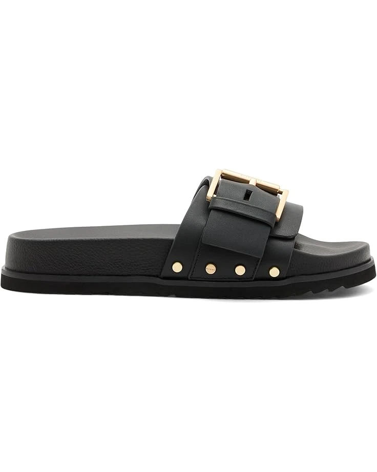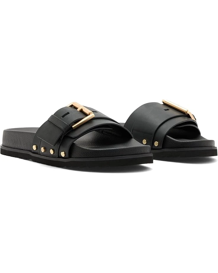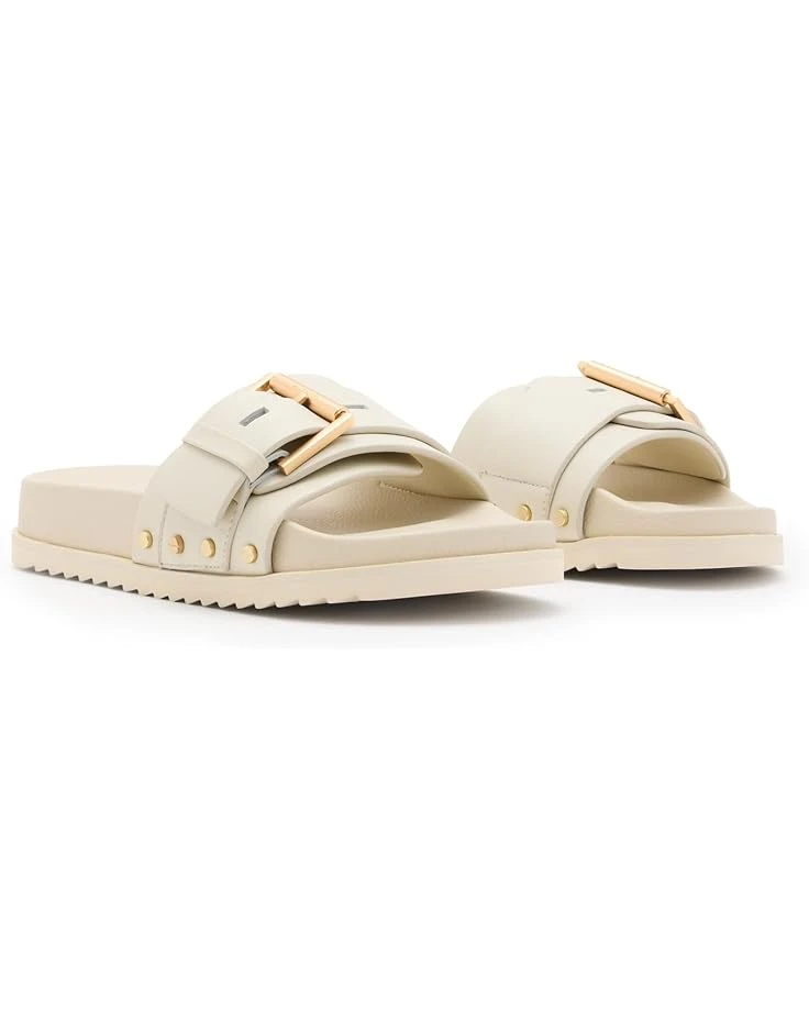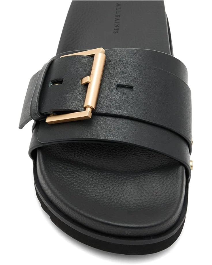 - Celebrate a luxurious style and superior comfort all day and every day wearing the AllSaints™ Ellie Stud Slider Sandals. Topped with an oversized branded square roller buckle strap on the leather upper and embellished with stud accents on the sides, the shoes are durable and fashionable. These are grounded on a contoured and padded rubber footbed for enhanced support and come in a slip-on style.