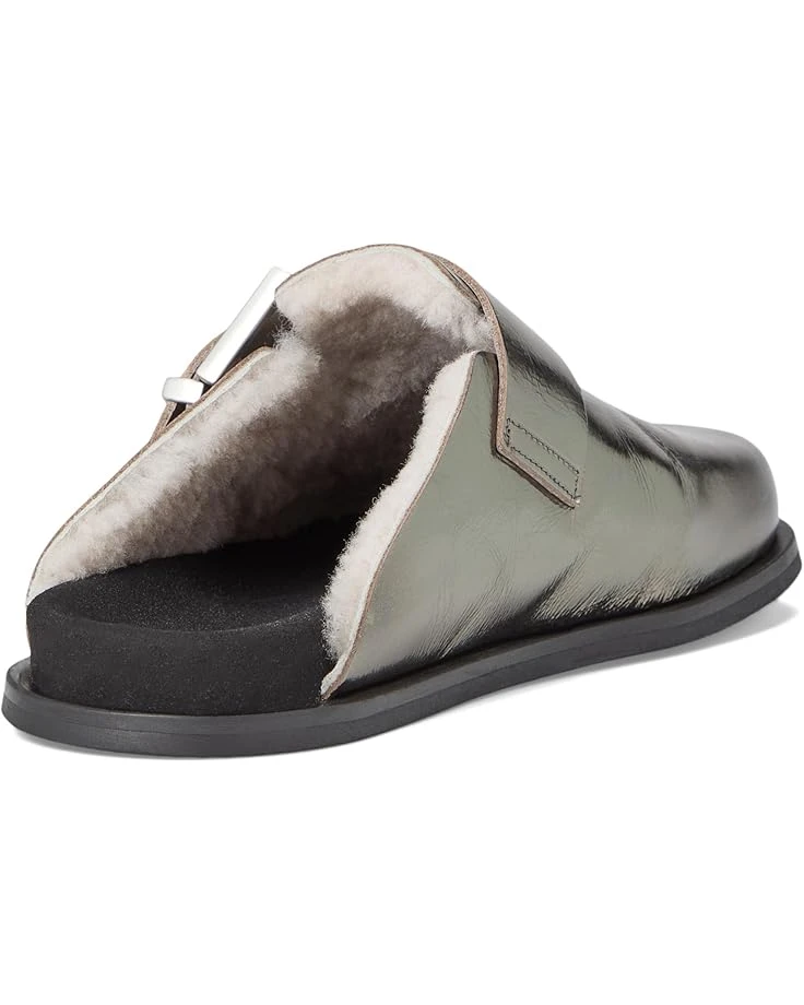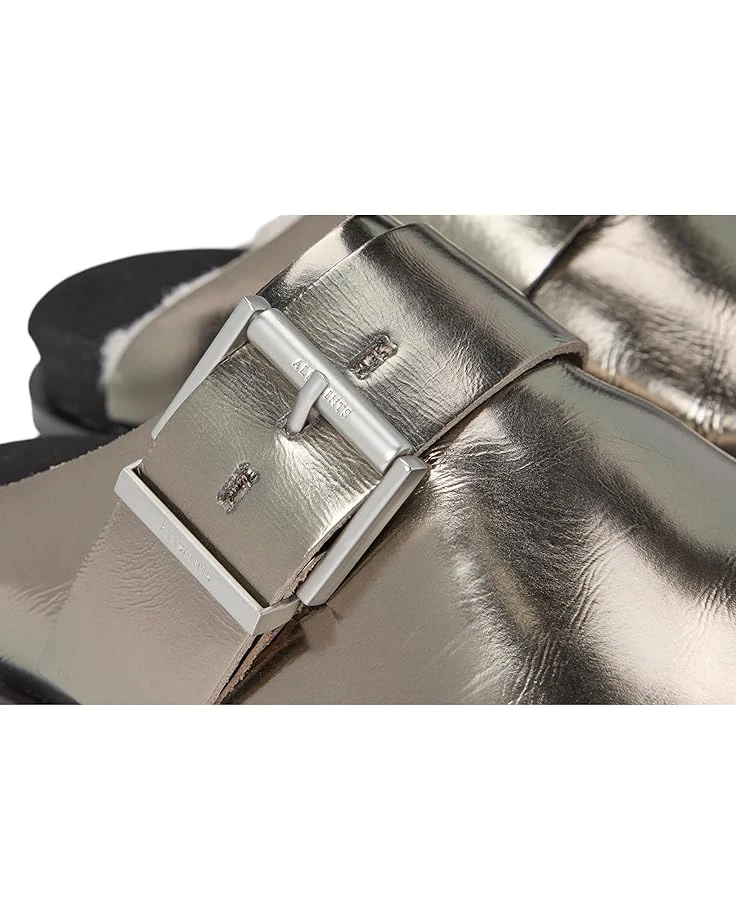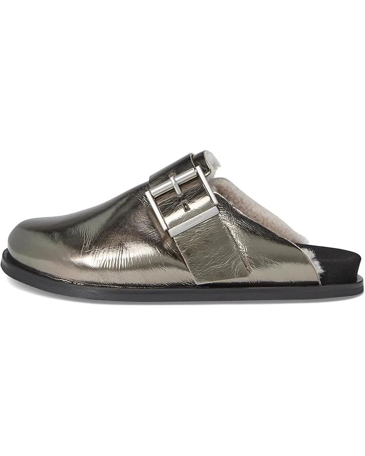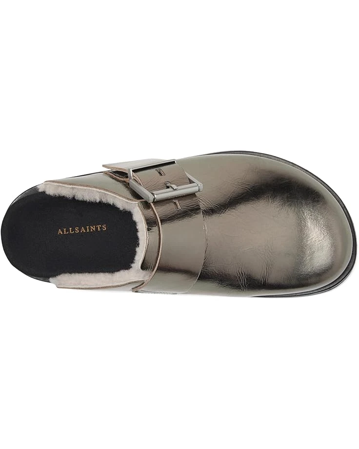 - Add a modern edge to your classic style by pairing your casual or partywear ensemble with the AllSaints™ Eris Mule. The round-toe, low-top mule is crafted with a metallic suede upper, shearling lining, and a microsuede fur insole. The stunning buckle detail gives the look a stylish update and the easy slip-on fit allows easy on/off.