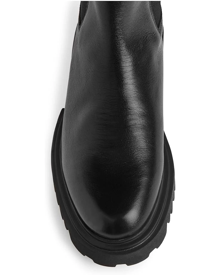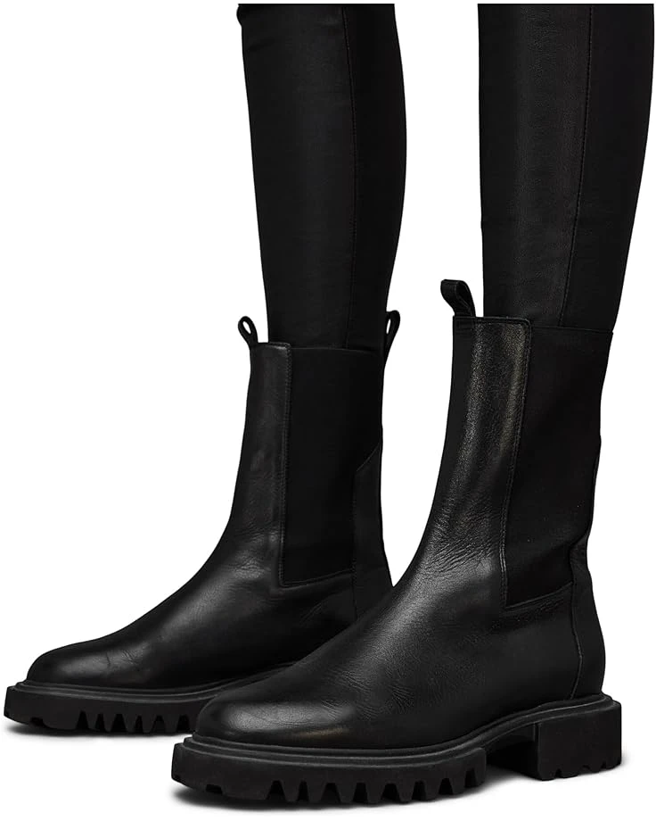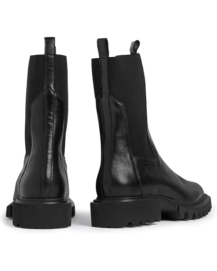 - Own your legacy, conquer your path styling AllSaints™ Hallie Boots. These Chelsea boots redefine sophistication with a calf-high silhouette and chunky cleated sole. Crafted from premium leather with a supple goat leather lining, they offer unparalleled comfort and durability. The round toe and sleek design make them a versatile wardrobe staple, while the EVA outsole ensures lightweight traction. With front and back pull tabs for effortless wear and an elasticized fit, slipping them on is a breeze.