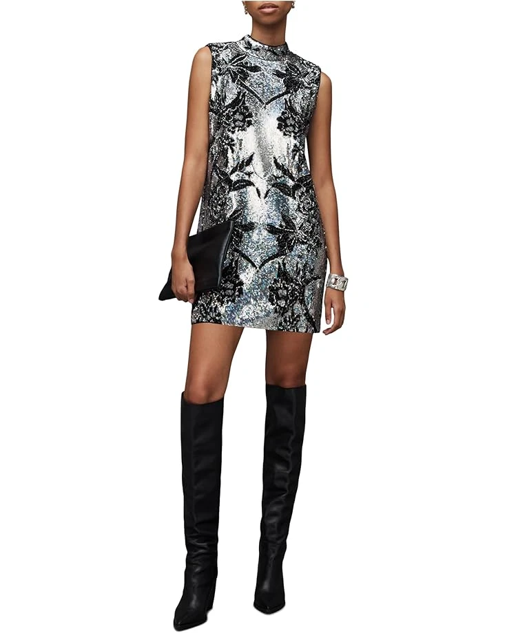 - Strike a confident and glamorous pose in the embellished AllSaints™ Harper Mini Embroidered Dress rendered from a dramatically silver and floral-shaped beading. The straight mini-length silhouette features a funnel neckline and sleeveless construction with a straight hemline.