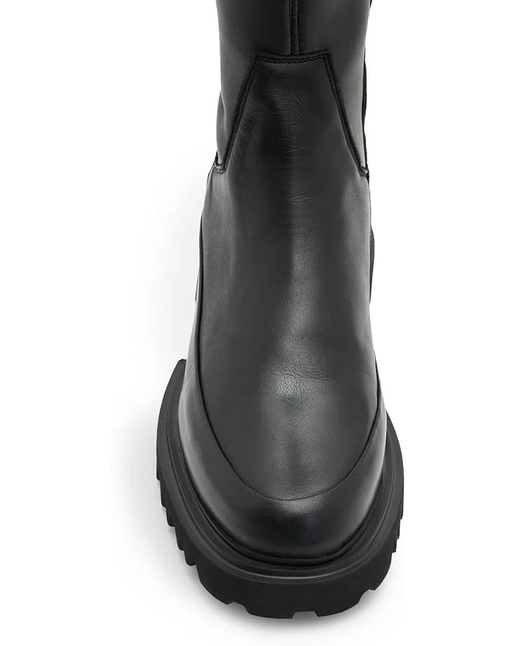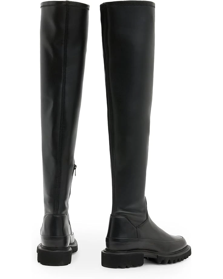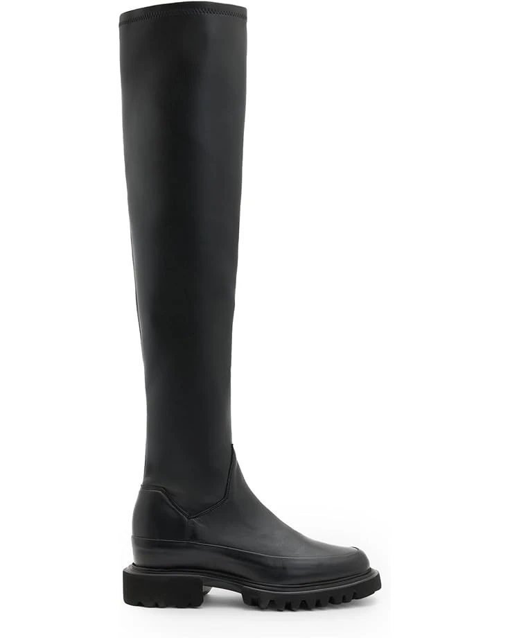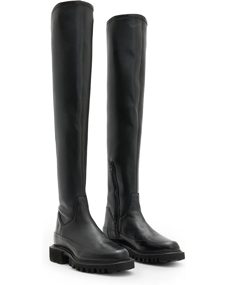 - A dramatic silhouette that remains a seasonal staple, take it over the knee wearing the AllSaints™ Leona Boots. Made with a soft leather upper with a little bit of stretch, these boots feature a zippered side closure that gives ease to the fit and keeps things comfy. These pull-on boots are designed with a leather insole and lining that offers durability. The modern shape features a round toe silhouette and a slightly chunky EVA outsole. These tall boots look great with mini skirts and short dresses.