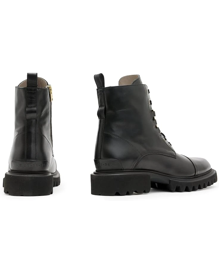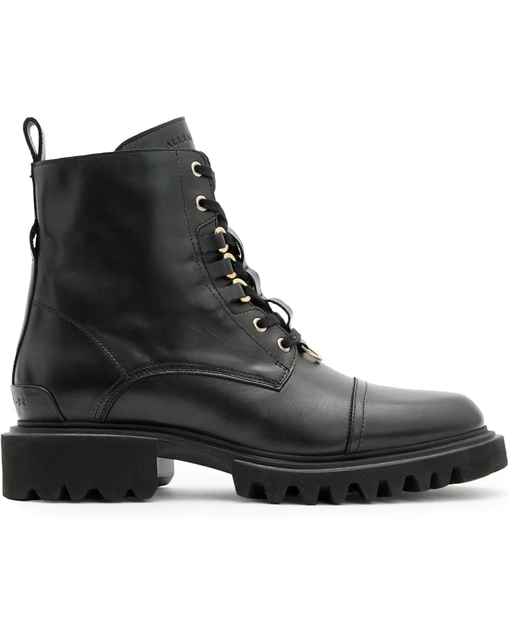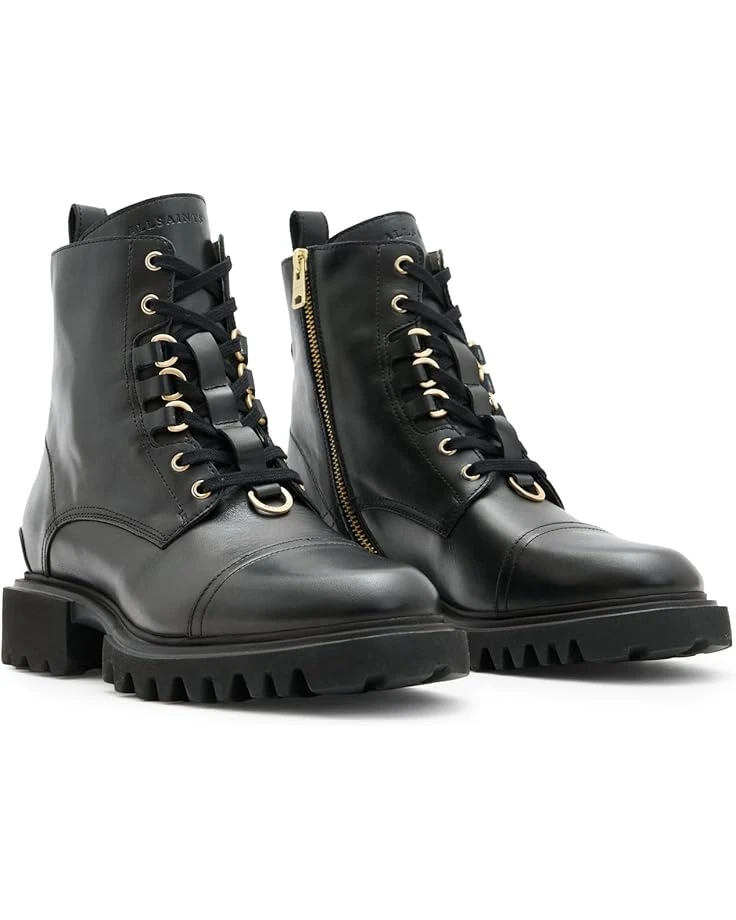 - More than just boots: The AllSaints™ Lydia Boots. Designed for those who dare to stand out, these calf-high boots showcase a striking lace-up front with ski hooks and a buckle toe strap for a touch of rebellion. The sleek leather upper and goat leather lining ensure unmatched comfort and durability, while the chunky EVA outsole provides superior traction. The side zip closure offers effortless wear, and the signature metal hardware adds an iconic finishing touch.