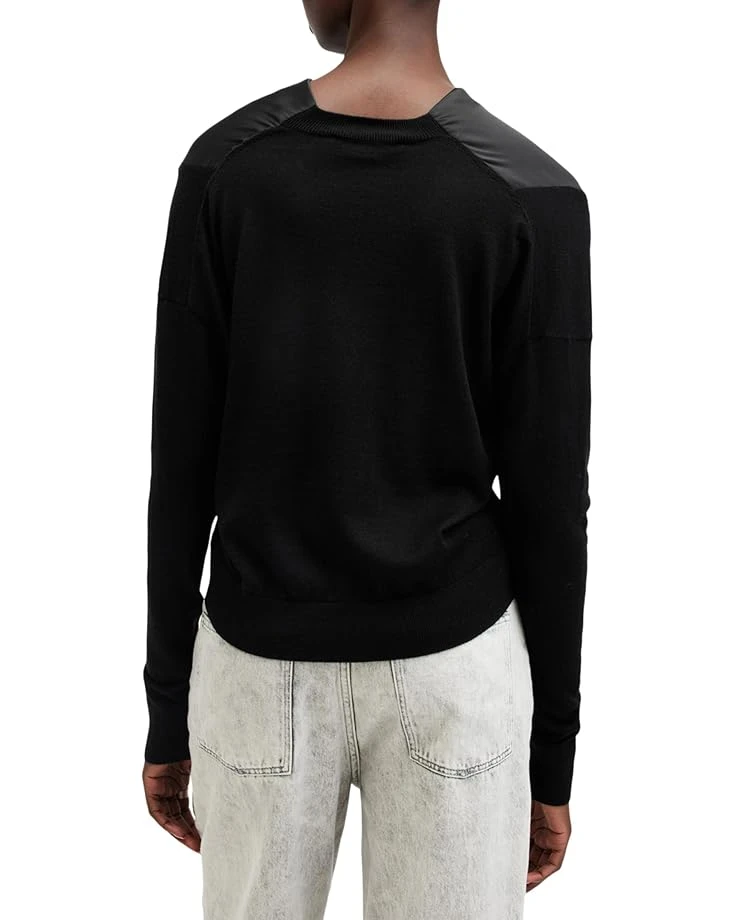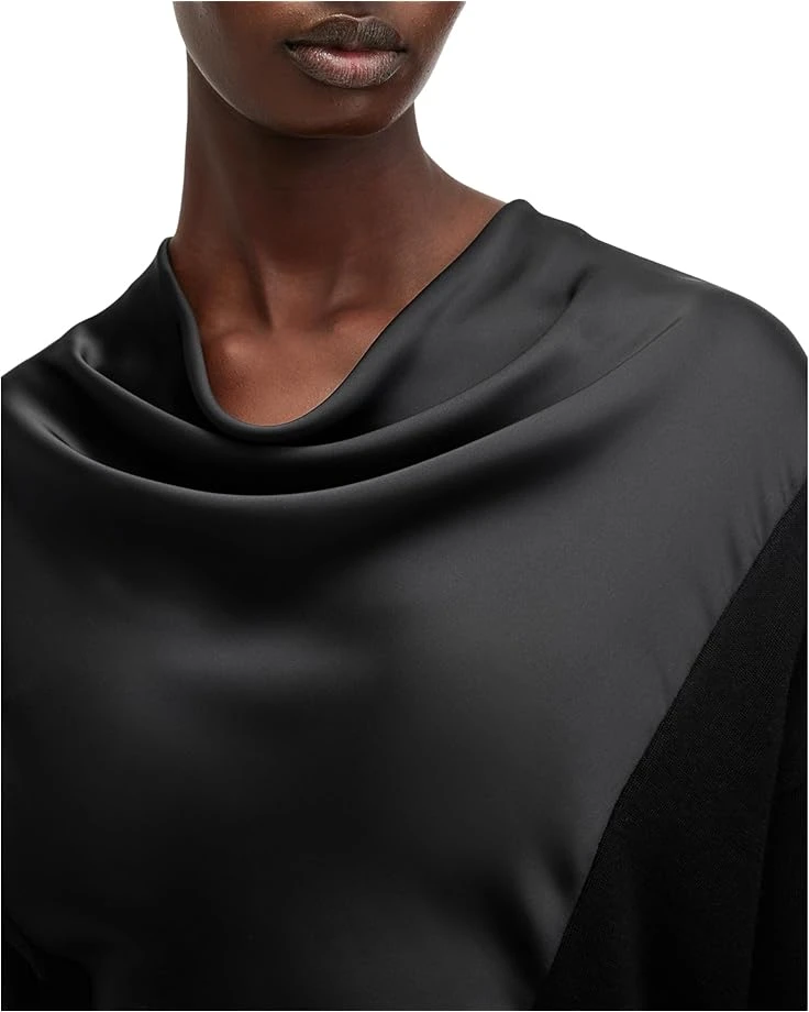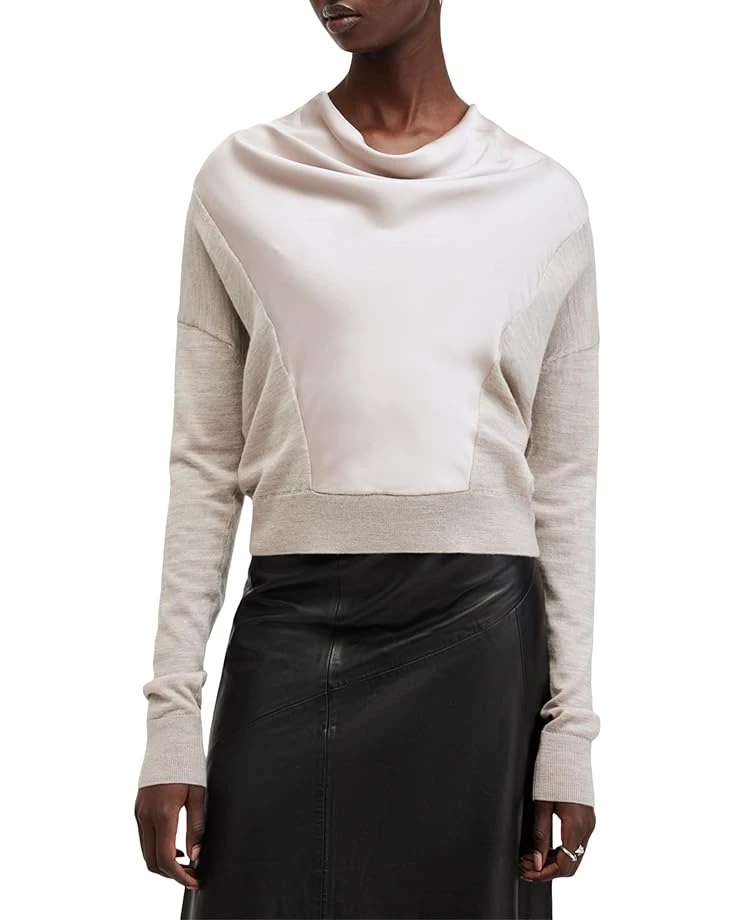 - Indulge in effortless chic: The AllSaints™ Myra Cowl Jumper. This timeless classic-fit sweater features a chic cowl neck and long sleeves, perfect for effortless layering. Crafted from lightweight merino wool, it offers unmatched softness and breathability, keeping you stylishly comfortable all day. A panel of lustrous satin adds a touch of elegance, enhancing the luxurious drape and elevating its modern aesthetic. The pull-on design ensures fuss-free wear, making it a versatile go-to for workdays or weekend outings.