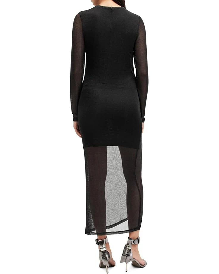 - The AllSaintsâ„¢ Nora Sparkle Dress is designed with sparkle trim to add a hint of glamorous charm. This slim fit dress features a crew neckline and sheer long sleeves, offering a sleek silhouette. The midi-length hem ends with a side leg slit, while the ruched front creates flattering gathers.