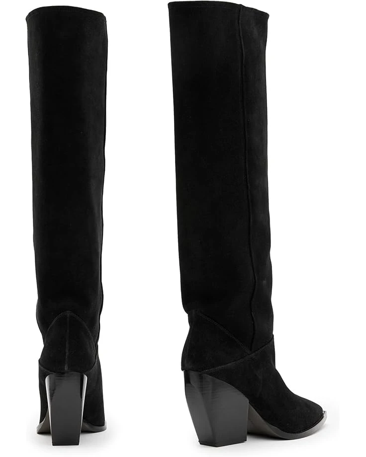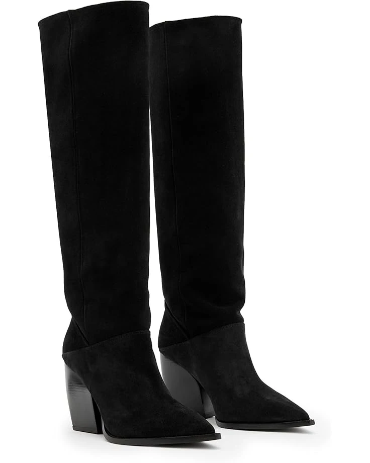 - Crafted with a suede upper, the AllSaints™ Roberta Suede Boots feature a sophisticated shape with a classic feel. The upper of these boots features a pull-on style for easy on and off. These heeled boots are designed with a leather insole and sheep leather lining. Perfect to dress up or down, these leather boots are versatile.