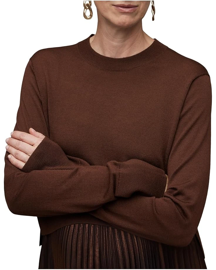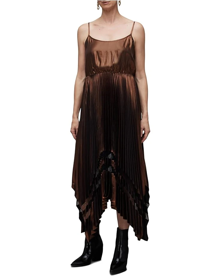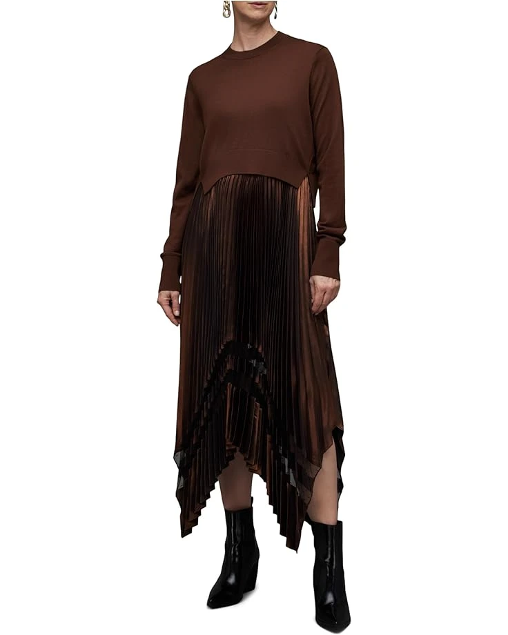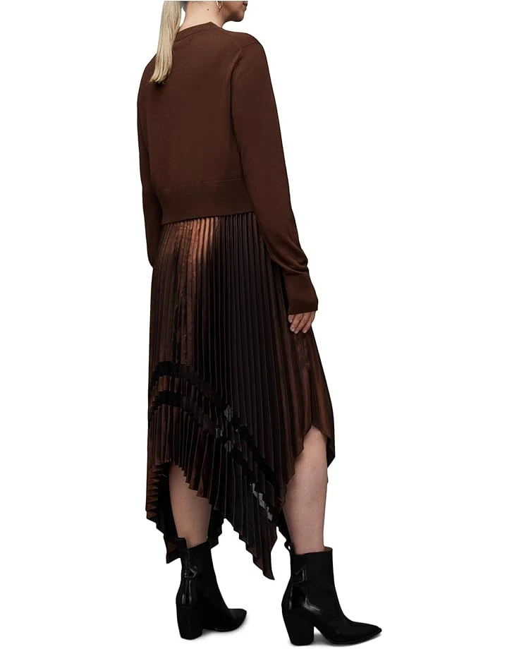 - Look stunning while staying warm in this two-in-one pullover style AllSaints™ Sadie Foil Dress with sweater crop top. The midi-length pleated asymmetrical dress features scoop neck, spaghetti straps, and an elasticized waist. The crop top pullover sweater features ribbed crew neck, long sleeves with ribbed cuffs, and straight hem with side split.