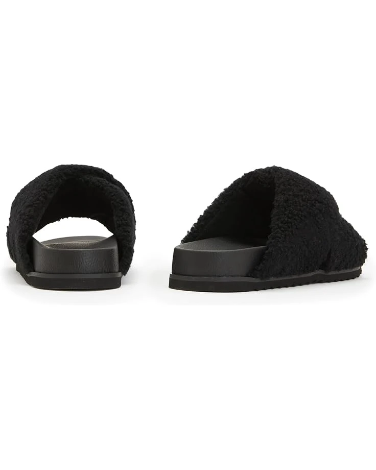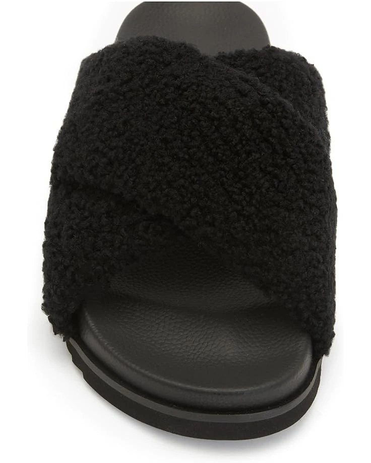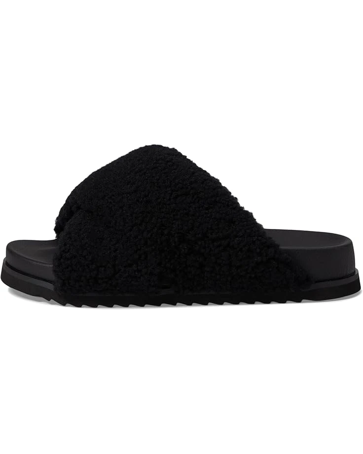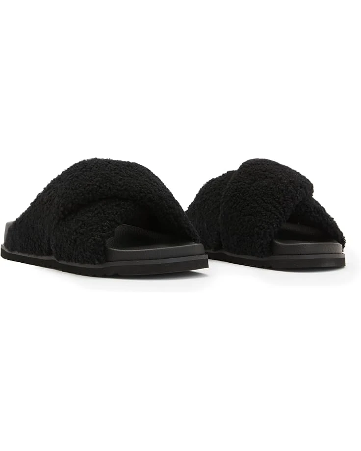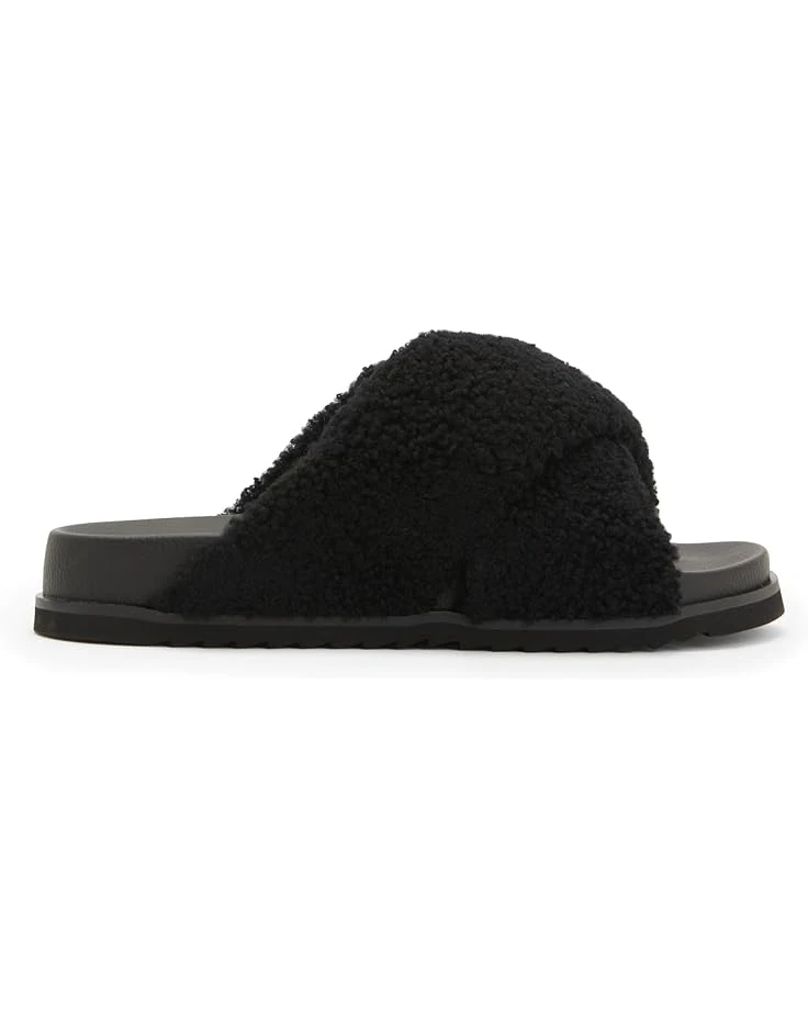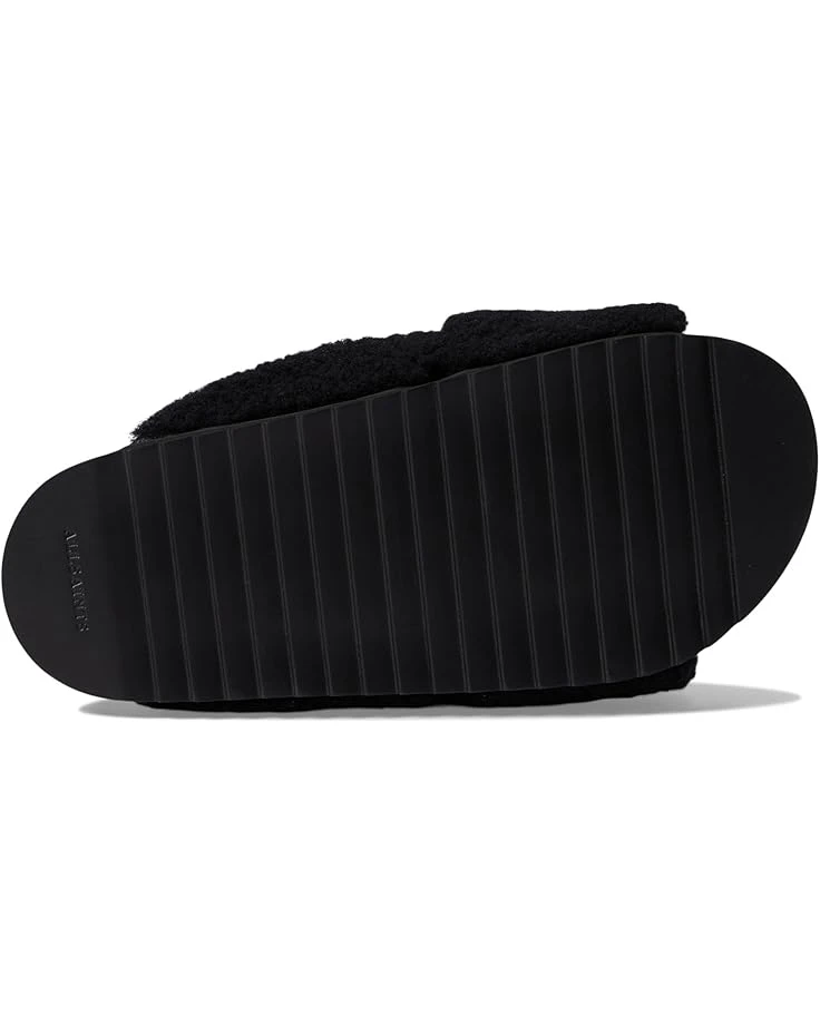 - Make your strolling experience perfect on sunnier days by wearing AllSaintsâ„¢ Saki Shearling Sandal. The sandal has a recycled shearling lining, loafer flat, and crossover shearling upper with molded footbed. An oversized crossover padding makes this Saki shearling sandal an instant choice for an outing. Molded rubber footbed and pull-on style.