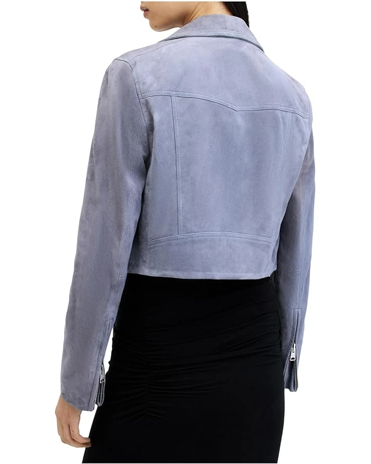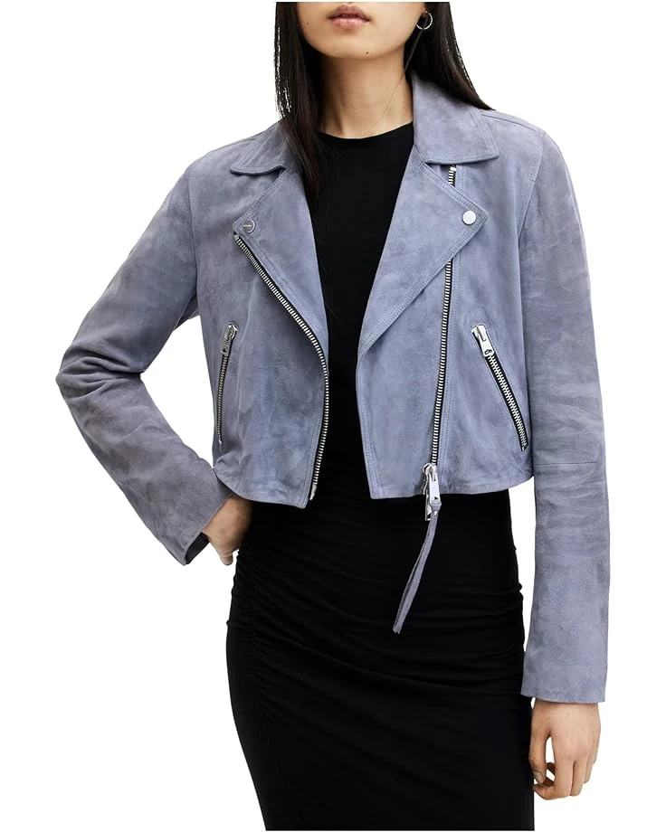 - Elevate your outerwear game wearing the AllSaintsâ„¢ Suede Dalby Crop Biker jacket. This stylish jacket features a notched lapel collar and long sleeves with zippered placket for a chic look. The zippered front closure and leather zip pulls add a touch of edge to your outfit.
