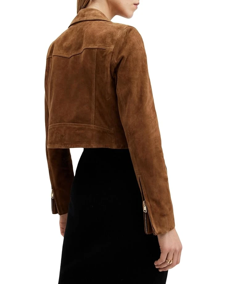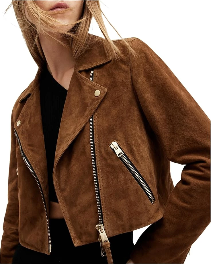 - Crafted from a soft suede with metal trims in a cropped fit, the AllSaints™ Suede Dalby Crop Biker is the perfect addition to your chic wardrobe styling. Featuring a notch lapel with an asymmetric front zipper closure, long sleeves and a slim fit silhouette.