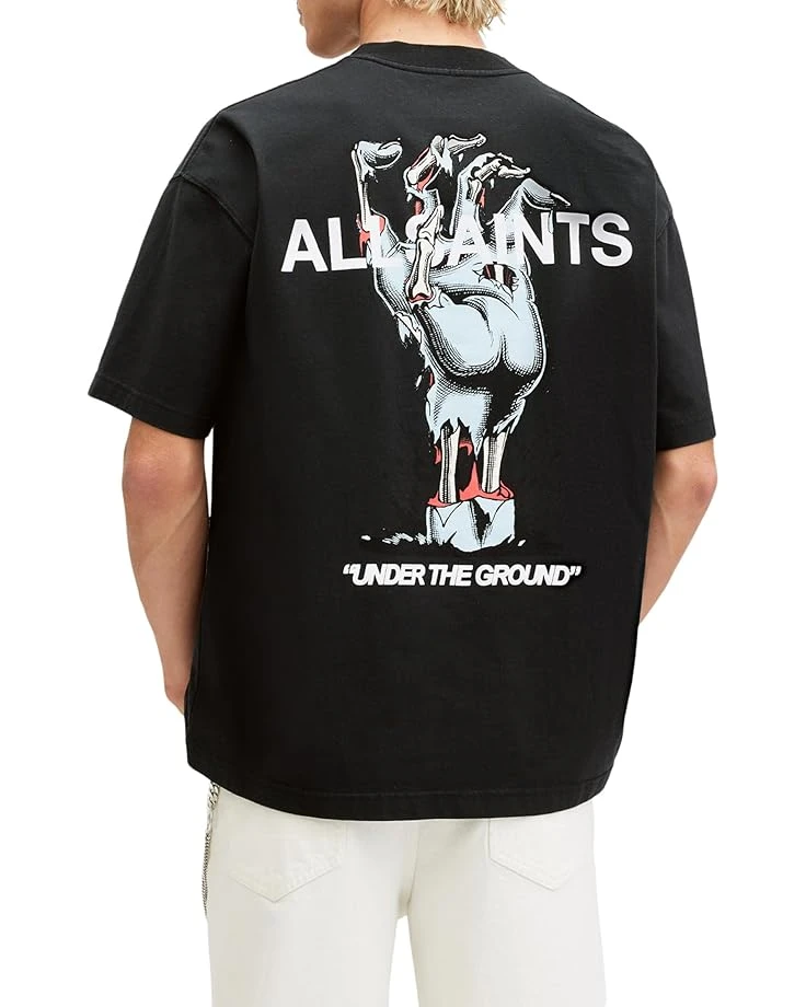 - Add a touch of allure with the graphics printed AllSaints™ Undergang Short Sleeve Crew neck shirt. Crafted from an organic cotton to our staple oversized silhouette with a crew neck and short sleeves. You’ll want to add this into your rotation.